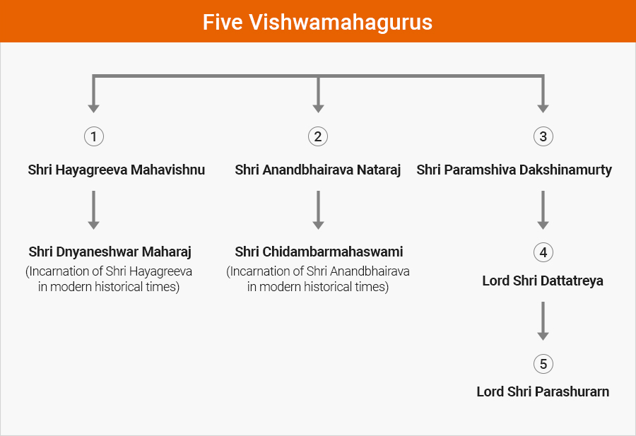 The paramount significance of five world preceptors – Vishwamahagurus in the discipline of Shreevidyamahayoga is one of the characteristic features of this spiritual tradition. These five world preceptors are: Lord Shri Dakshinamurty Paramshiva, Lord Shri Dattatreya, Lord Shri Parshuram, Bhagawan Shri Dnyaneshwar Maharaj and Bhagawan Shri Chidambarmahaswami. Every spiritual aspirant brought into the fold of Shreevidyamahayoga through an initiation from Shri Shriniwasji has to pay his worshipful devotion to all of these five Vishwamahagurus in adition to his own Guru to gain the blessings of them to progress himself in the path of Shreevidyamahayoga. Without receiving the blessings of these world teachers, it is just impossible to progress in this path of Shreevidya even though one has undergone all those initiatory processes under the guidance of the worthy Guru. Hence, it is very necessary to bring out the spiritual significance of the line of Vishwamahagurus before those who are desirous to get themselves included in this tradition through initiation.