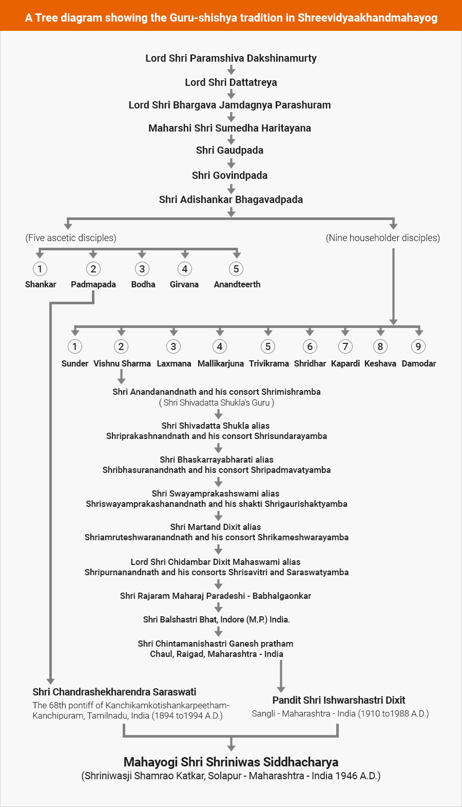 The “Guru-shishya” tradition that followed right from Lord Paramshiva Shri Dakshinamoorty to the current preceptor of Shrividyaakhandmahayog Mahayogi Shri Shriniwas Siddhacharya is illustrated in the following tree diagram.